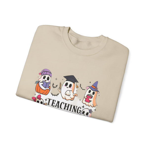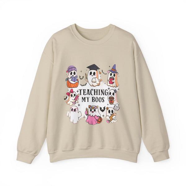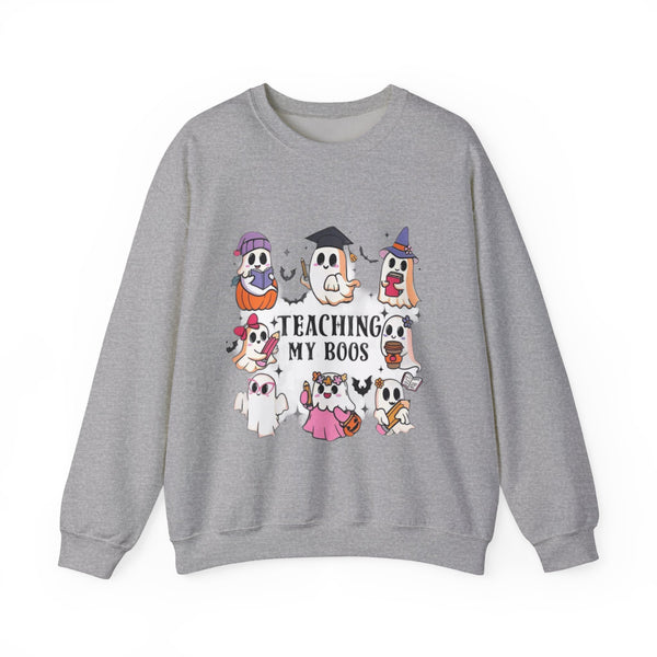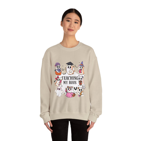 A Halloween-themed sweatshirt designed for teachers or para-professionals, featuring the phrase 'teaching my boos'. Perfect for those looking to show their festive spirit in the classroom during the Halloween season.